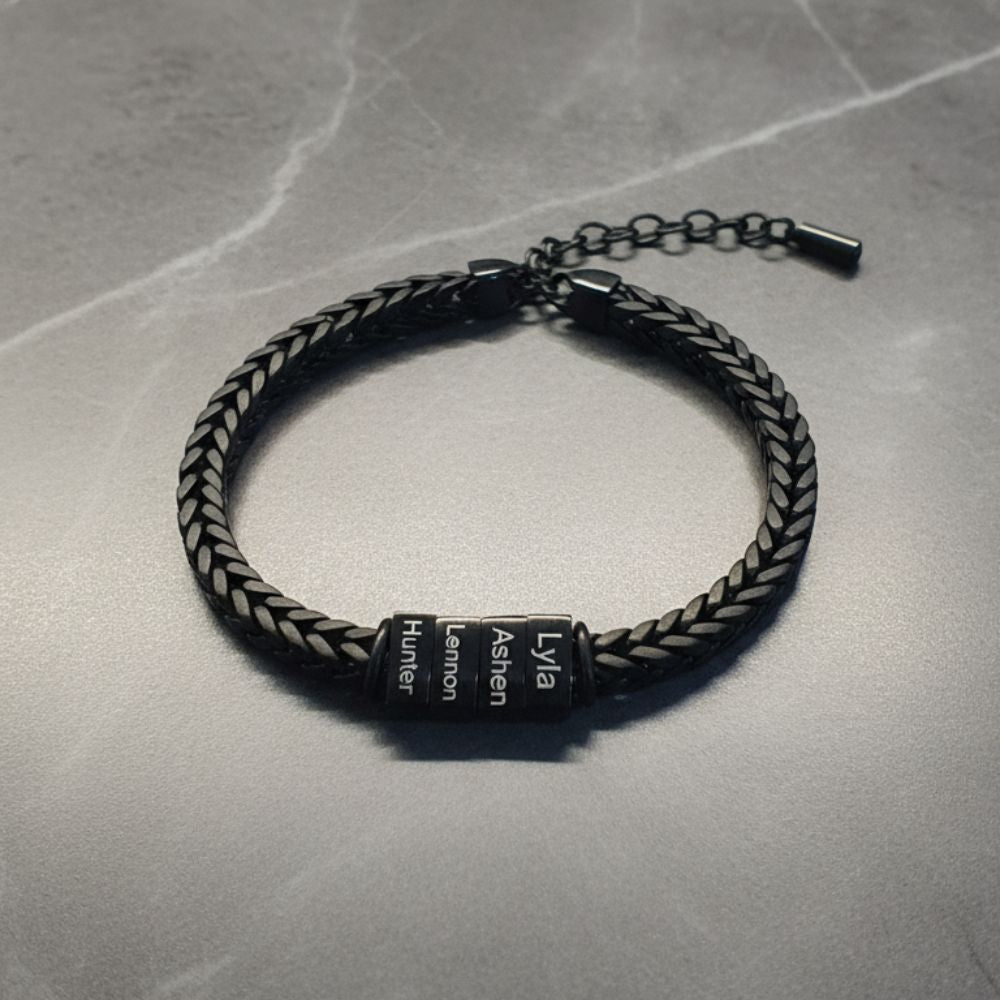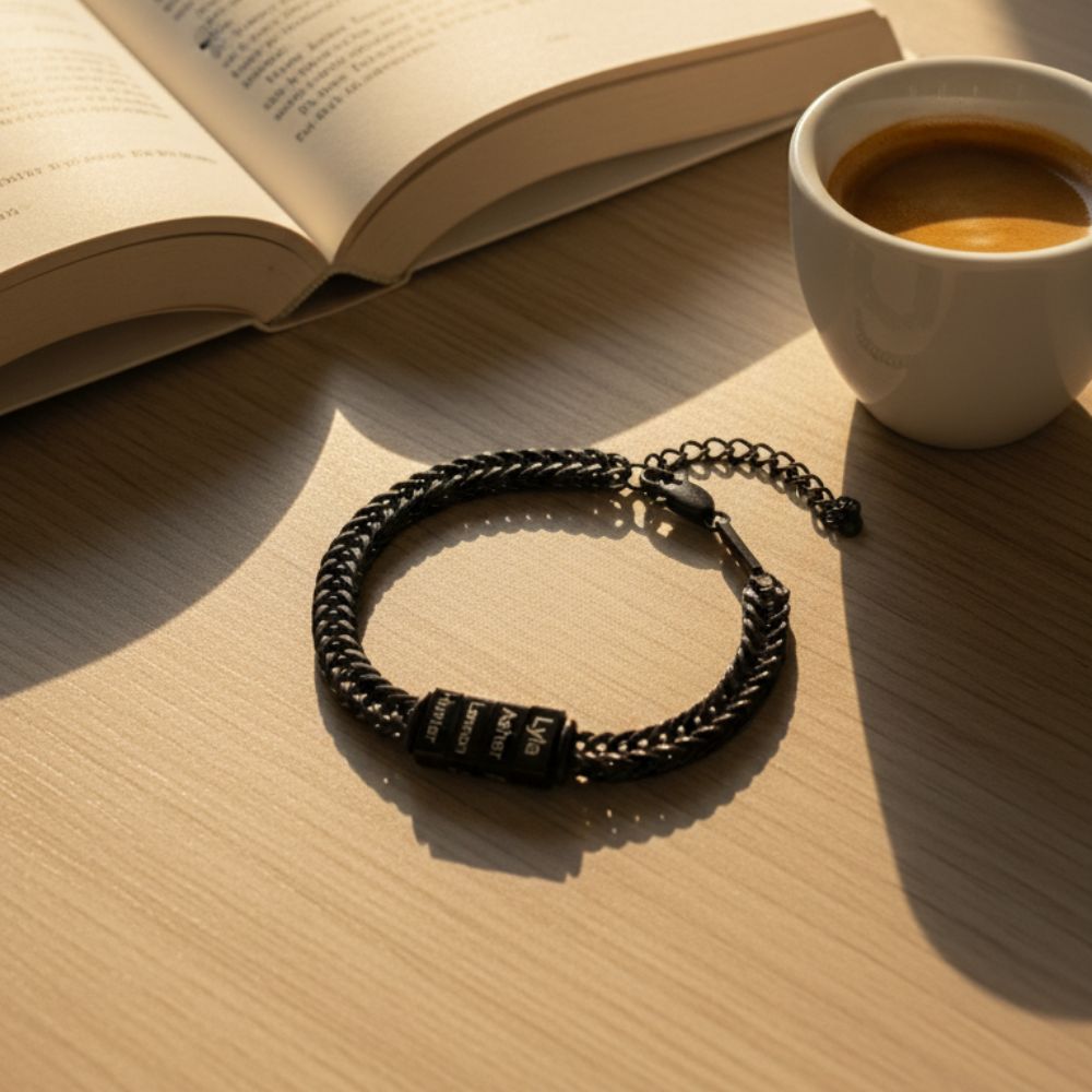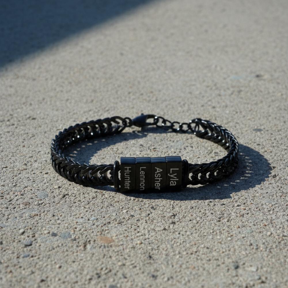 The Men's Personalized Black Chain Bracelet, the essential accessory that perfectly balances modern style and deep personal meaning. This piece features a unique, finely woven black link pattern, creating a look that is more refined and less bulky than traditional heavy chains. It is designed for comfortable daily wear and offers a sleek silhouette that instantly elevates any outfit.