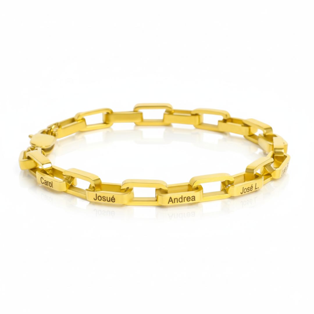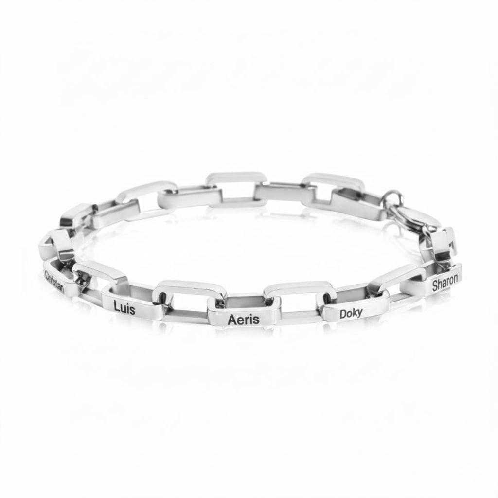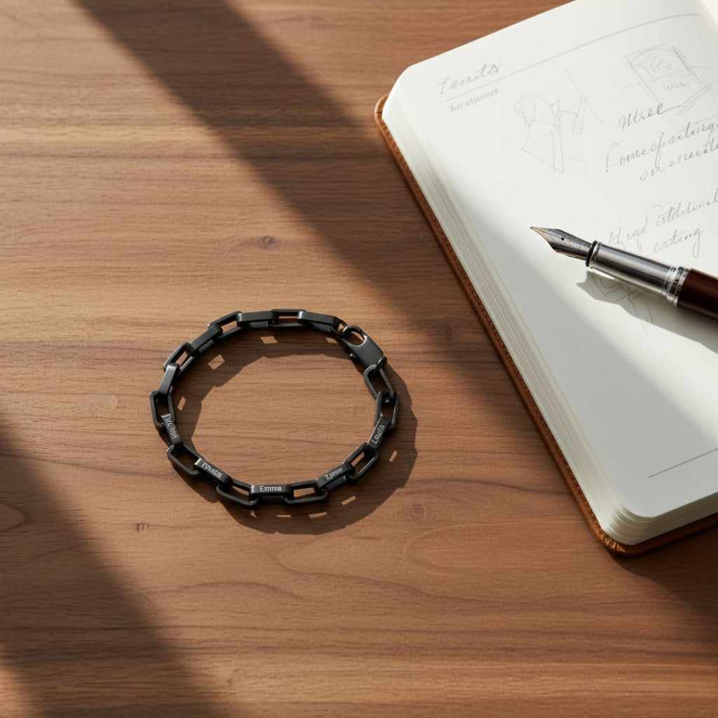 Craft a symbol of your cherished connections with the "Custom Stainless Steel Link Bracelet." This durable, elegantly designed piece is perfect for anyone wishing to carry a piece of their heart on their wrist. Engrave up to five names – be it your children, siblings, or friends – and keep your loved ones with you throughout the day. Available in three stunning finishes: the warmth of 18ct gold plating, the classic sheen of silver, and the bold statement of black. Each finish is chosen to complement your personal style while maintaining the timeless look of this bespoke accessory. Whether you're commemorating a special event, honoring your family, or simply treating yourself, this bracelet is as versatile as it is personal. It’s a fashionable testament to the bonds that matter most.