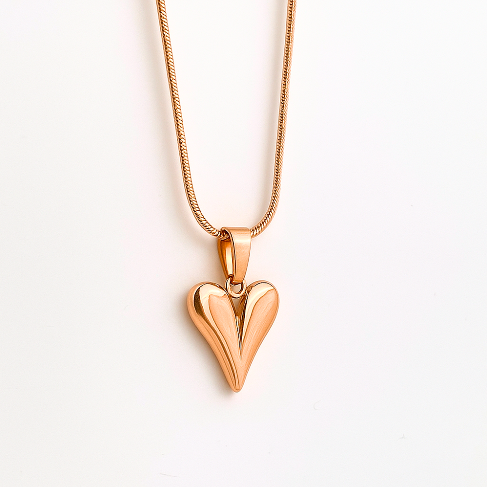 Simple, bold, and full of meaning – the Sculpted Heart Pendant Necklace in rose gold is made to stand out. With its smooth curves and polished finish, this modern heart design brings warmth and elegance to any outfit. Crafted from stainless steel with premium IP rose gold plating, it’s waterproof, tarnish-resistant, and designed to last.