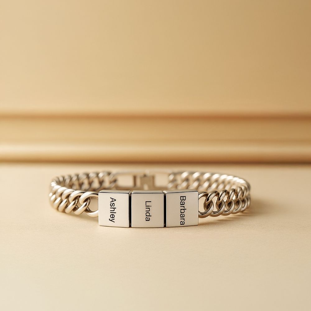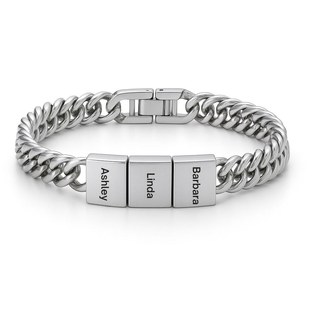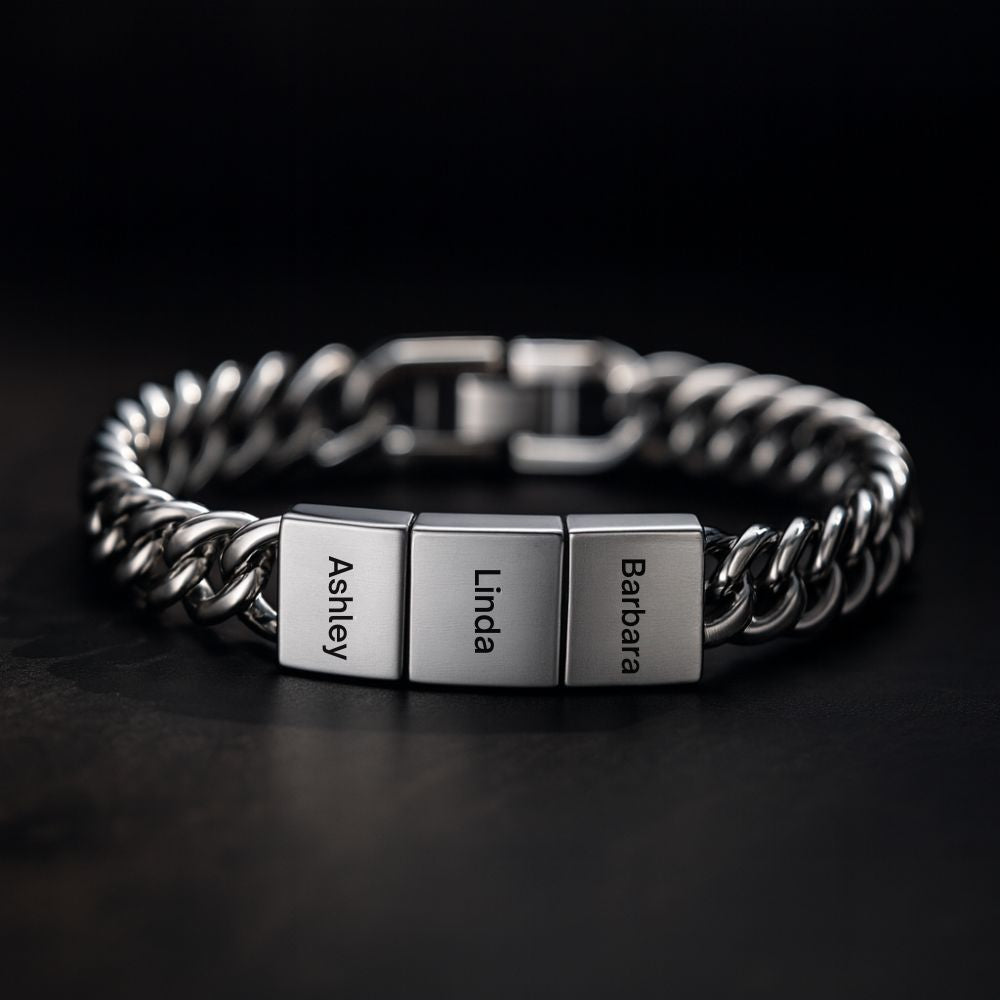 Craft a symbol of your cherished connections with the "Custom Stainless Steel Link Bracelet." This durable, elegantly designed piece is perfect for anyone wishing to carry a piece of their heart on their wrist. Engrave up to five names – be it your children, siblings, or friends – and keep your loved ones with you throughout the day. Available in three stunning finishes: the warmth of 18ct gold plating, the classic sheen of silver, and the bold statement of black. Each finish is chosen to complement your personal style while maintaining the timeless look of this bespoke accessory. Whether you're commemorating a special event, honoring your family, or simply treating yourself, this bracelet is as versatile as it is personal. It’s a fashionable testament to the bonds that matter most.